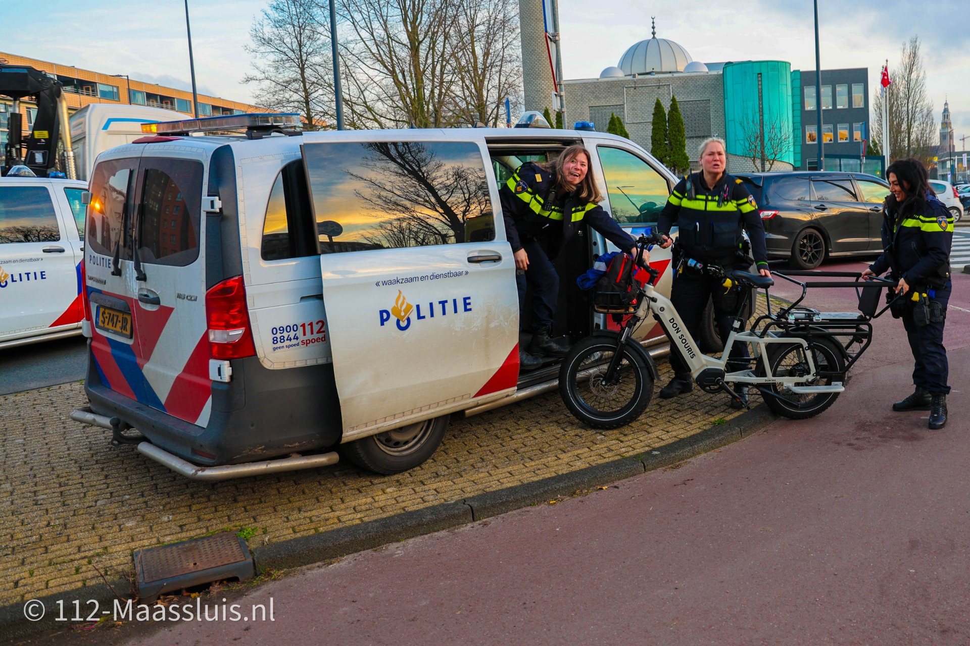 De oversized fatbike paste aanvankelijk niet in de dienstbus, maar na wat passen en meten — en gelach — is het de agenten gelukt om de fiets mee te nemen naar het politiebureau.