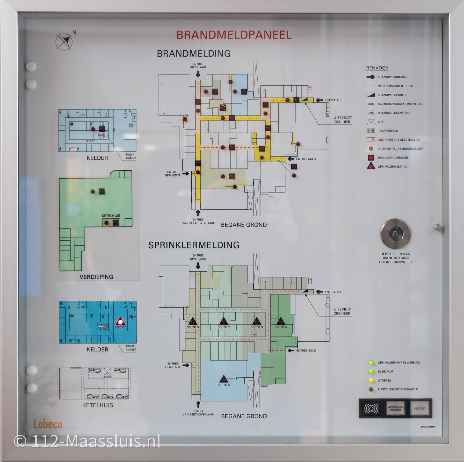 Op het overzichtsscherm (mimic-paneel) in de brandmeldcentrale was te zien dat er in de kelder van het winkelcentrum een storing of incident werd gemeld. Tijdens het afdalen richting de kelder was het geluid van stromend water al duidelijk hoorbaar.