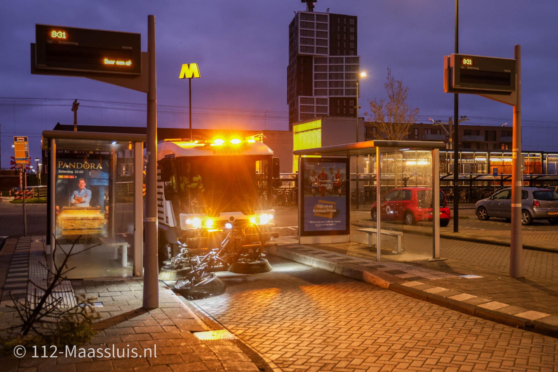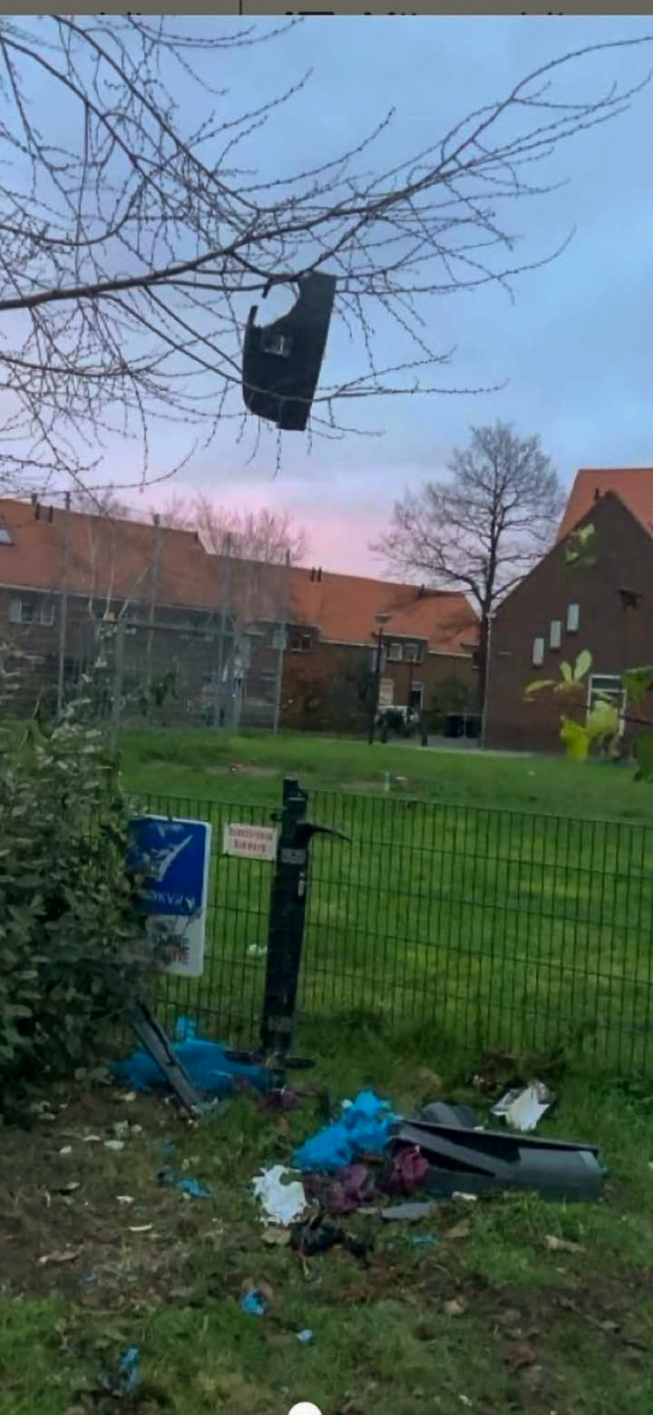 Medewerkers van het stadsbedrijf zijn druk bezig met het opruimen van de achtergebleven rommel, waaronder ook meerdere abri's die zwaar zijn beschadigd.